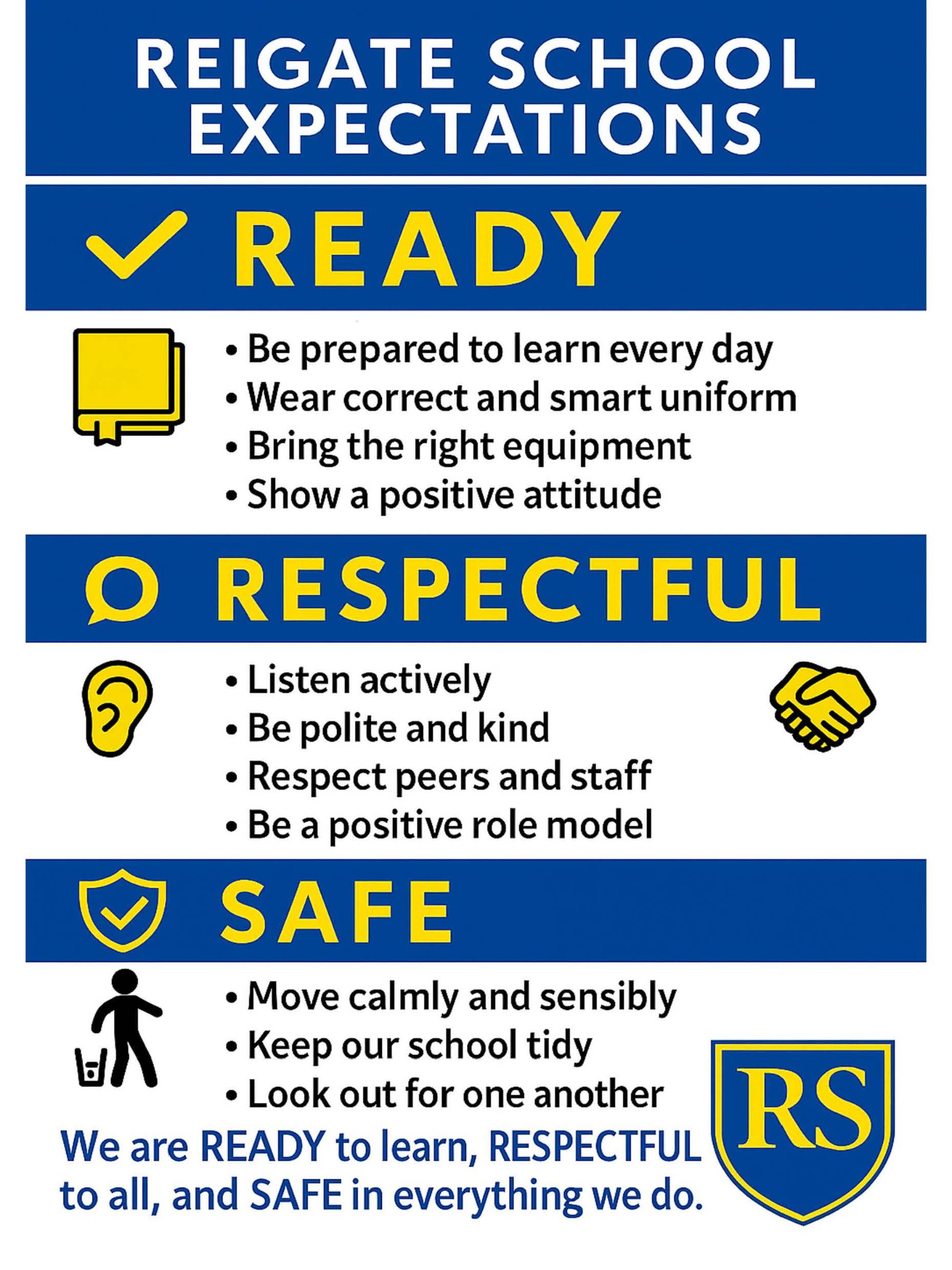 At Reigate School, we are committed to creating a calm, purposeful and supportive environment where every child can thrive. Our expectations are built around three simple, clear principles that guide behaviour across our community: Ready, Respectful, Safe (RRS). These expectations sit at the heart of our school culture and shape how we learn, interact and support one another each day. They are embedded into lessons, tutor time, assemblies and the wider life of the school.